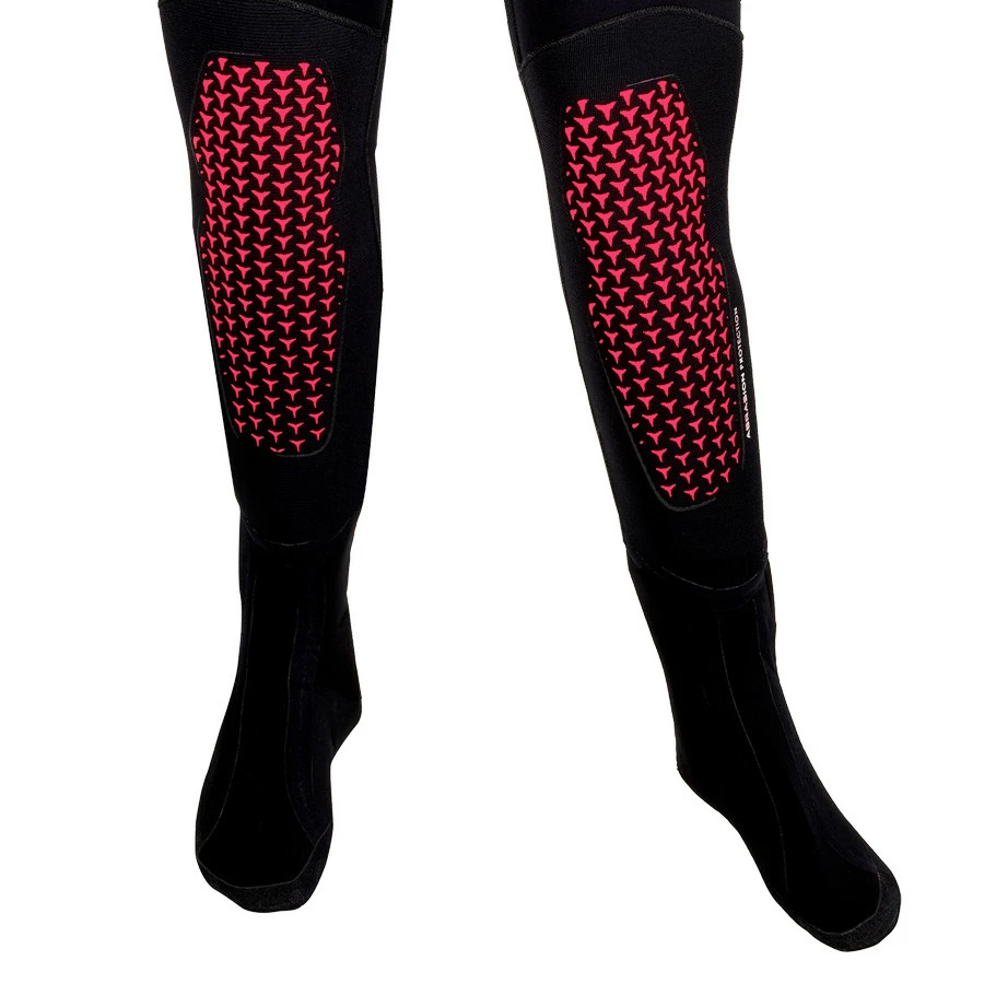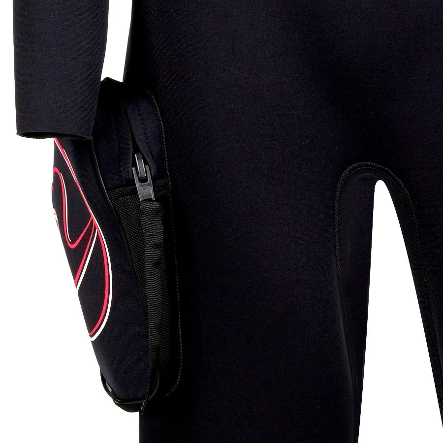 – Du néoprène compressé de 4 mm est utilisé sur l’ensemble du vêtement. Il offre une grande chaleur, conserve son épaisseur même lors de plongées profondes et limite la flottabilité.