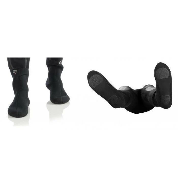 Les propriétés de conductivité thermique de la combinaison sont amélioré, un choix normal des tailles de palmes est conservé et la jonction critique entre le chausson et le mollet est évitée — c’est une des zones les plus fréquentes de rupture et donc d’entrées d’eau dans les combinaisons étanches.