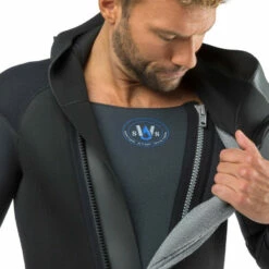 Combinaison humide mono-pièce avec épaisseurs différenciées (8, 6 et 5 mm) avec cagoule intégrée pour eaux froides.